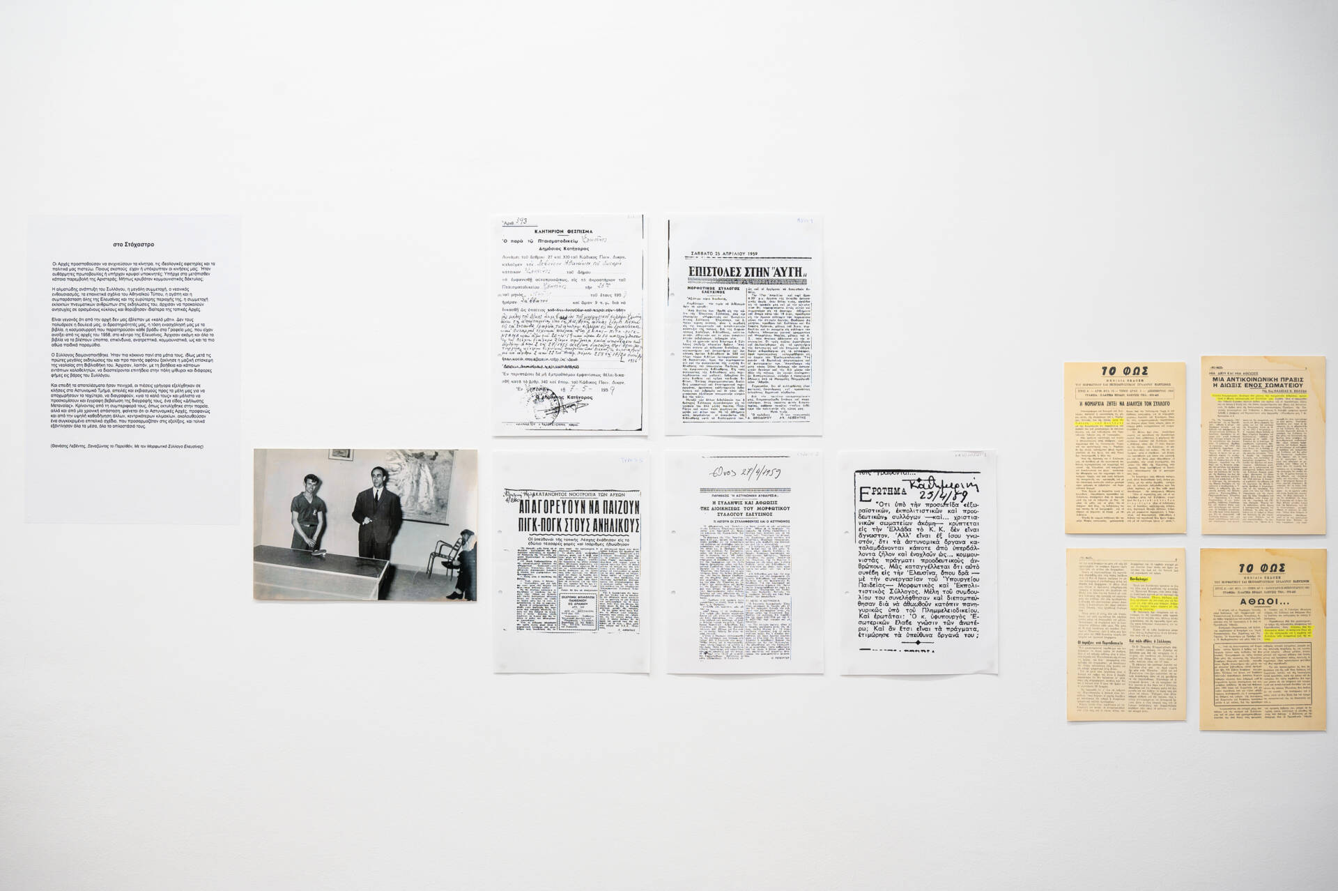 The Exhibition presents a defining part of Thanasis Leventis’s personal archive, including the issues of the magazine, photographs from artistic events and memorable moments, the statutes of the Association’s foundation, the Library’s activity register and many other documents of the first cultural association of the city. The exhibition is accompanied by the cinematic vision of Menelaos Karamaghiolis with video documentation of the life and activities of Thanasis Leventis and the Association.