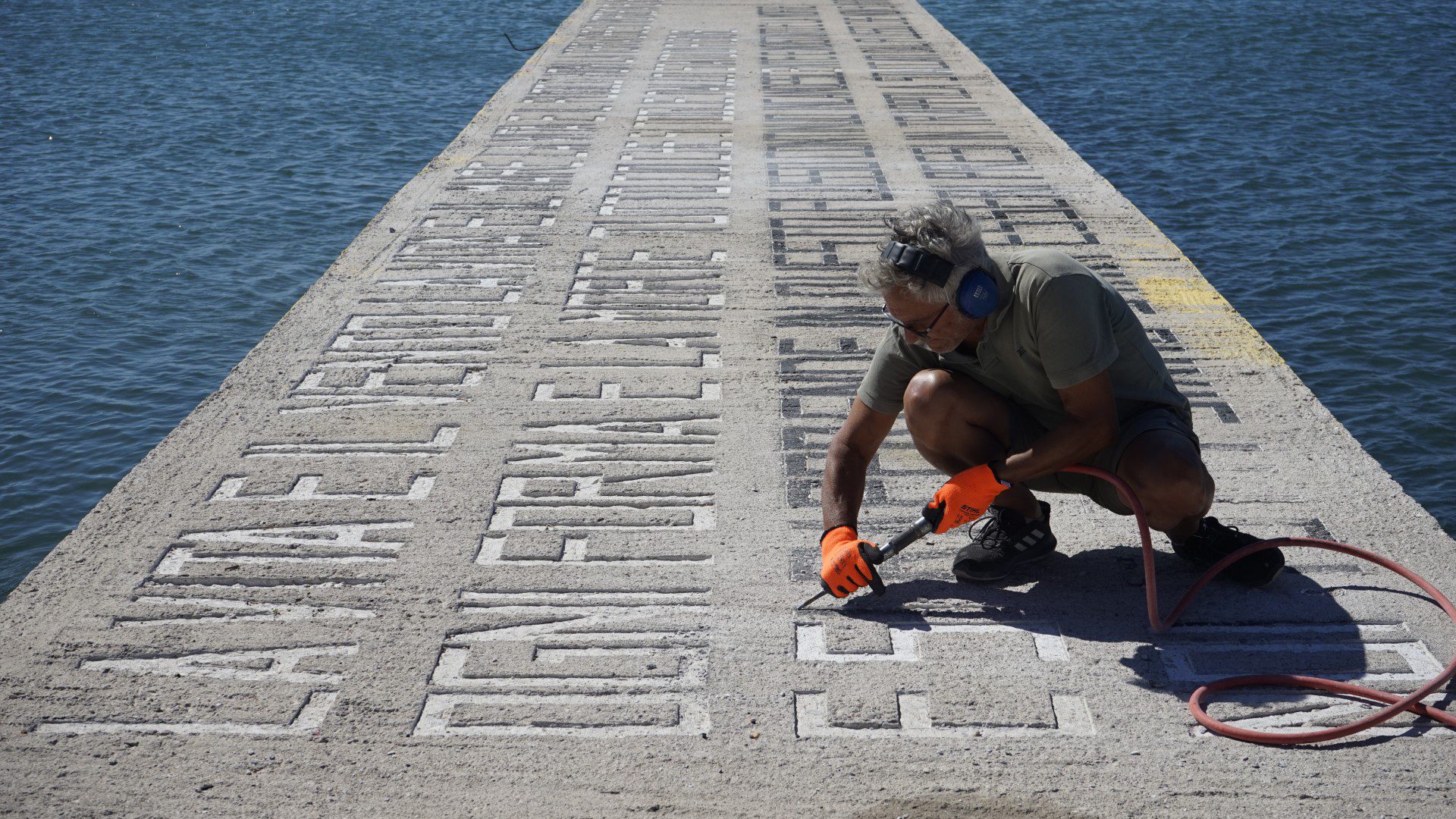 The idea for the work titled Epiphany emerged after the artist’s search for the elements that define Elefsina and the wider region, such as the unique, multi-layered historicity of the area and the city’s relationship with the landscape and the local residents. The art installation attempts to underscore some individual characteristics of the aforementioned elements and highlight a particular aspect of the public space, namely the pier as a symbol and a point of arrival, waiting and departure, which is directly linked to the city of Elefsina. Drawing on and referring to the inscriptions on tombstones or monuments, the artist uses the pier as a surface to write and engrave the following text in relief: