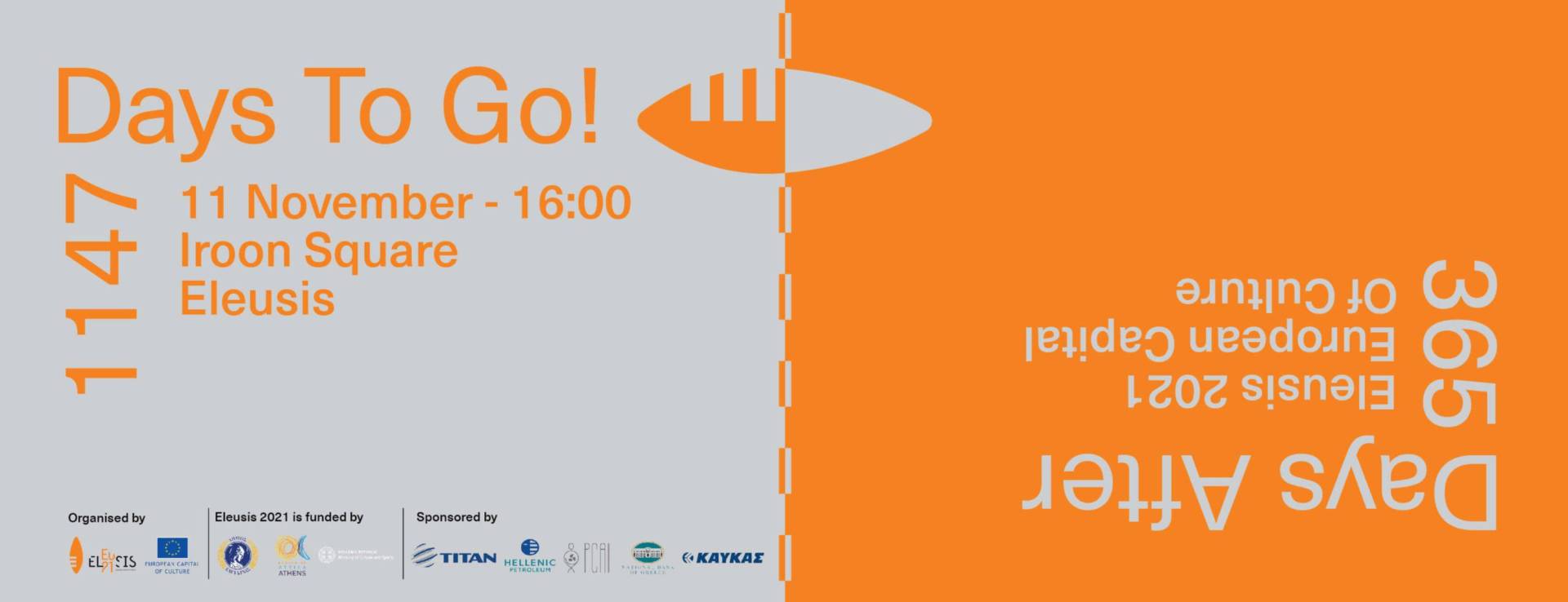 Το Σάββατο 11 Νοεμβρίου, η Ελευσίνα 2021 γιορτάζει τον ένα χρόνο από την ανακήρυξη της πόλης σε Πολιτιστική Πρωτεύουσα της Ευρώπης με ένα μεγάλης κλίμακας έργο στο δημόσιο χώρο και πρωταγωνιστές τα παιδιά της Ελευσίνας.